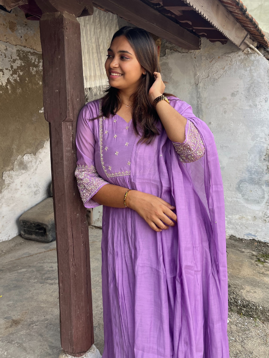 A beautifully crafted purple muslin party wear set designed to bring effortless elegance to your special moments. Soft, flowy, and gracefully embellished, this outfit is perfect for festive occasions, gatherings, and celebrations.